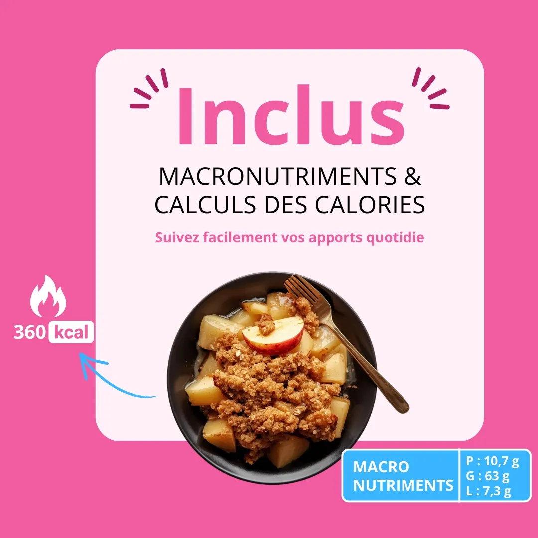 Pour vous aider à manger de façon plus équilibrée, chaque recette de l’ebook inclut les calories ainsi que les macronutriments (protéines, glucides et lipides) par portion.