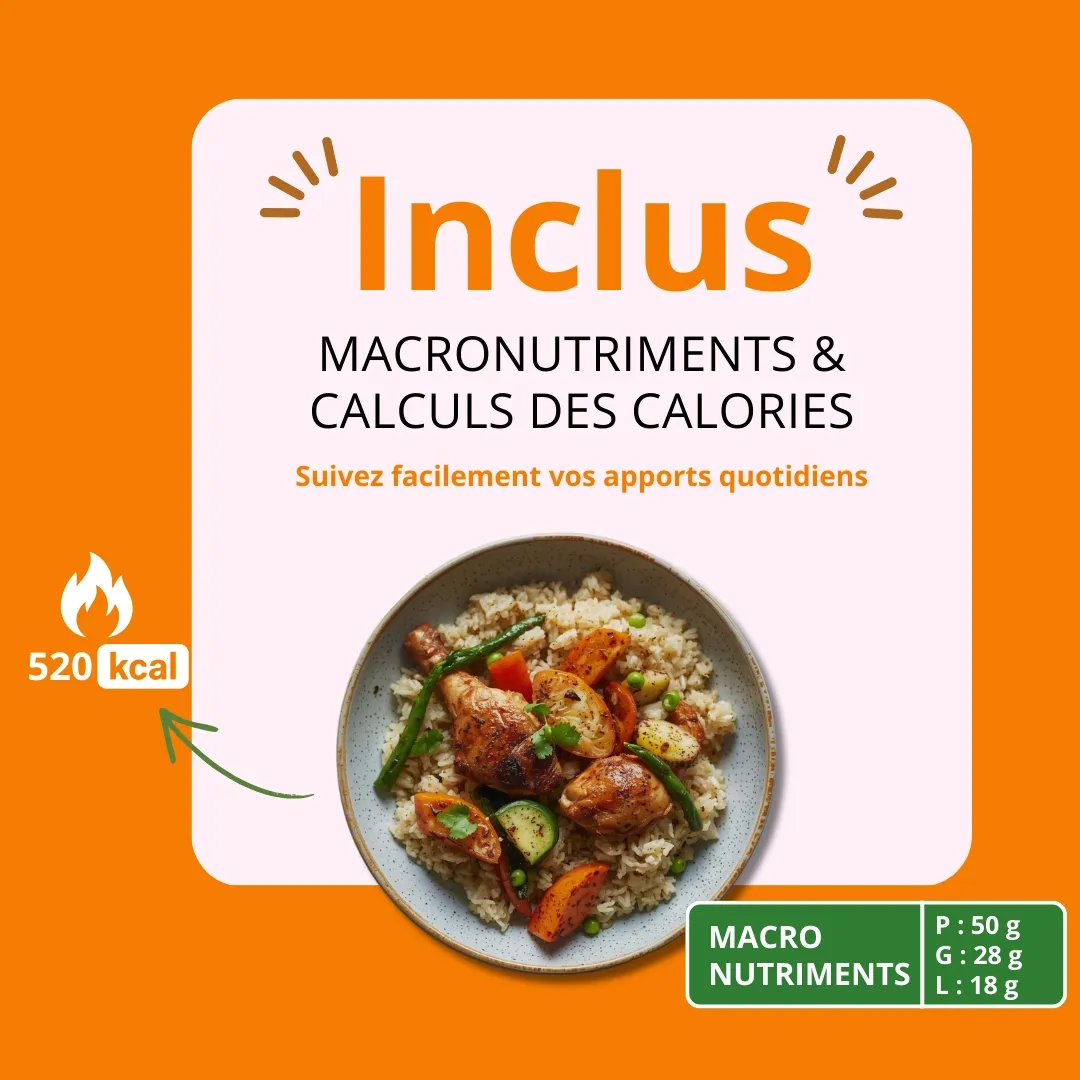 Pour vous aider à mieux gérer votre alimentation, les calories et les macros (protéines, glucides et lipides) sont indiquées pour chaque portion, afin que vous puissiez cuisiner tout en gardant le contrôle sur votre nutrition.